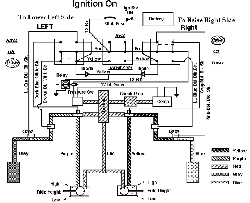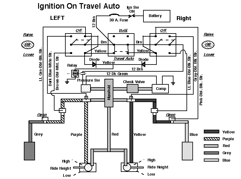 11). With the activator link on the ride height valve set as if the coach was at height or the coach jacked up, turn the ignition key on, move the right switch to raise and let off the air pressure. Turn off the key.