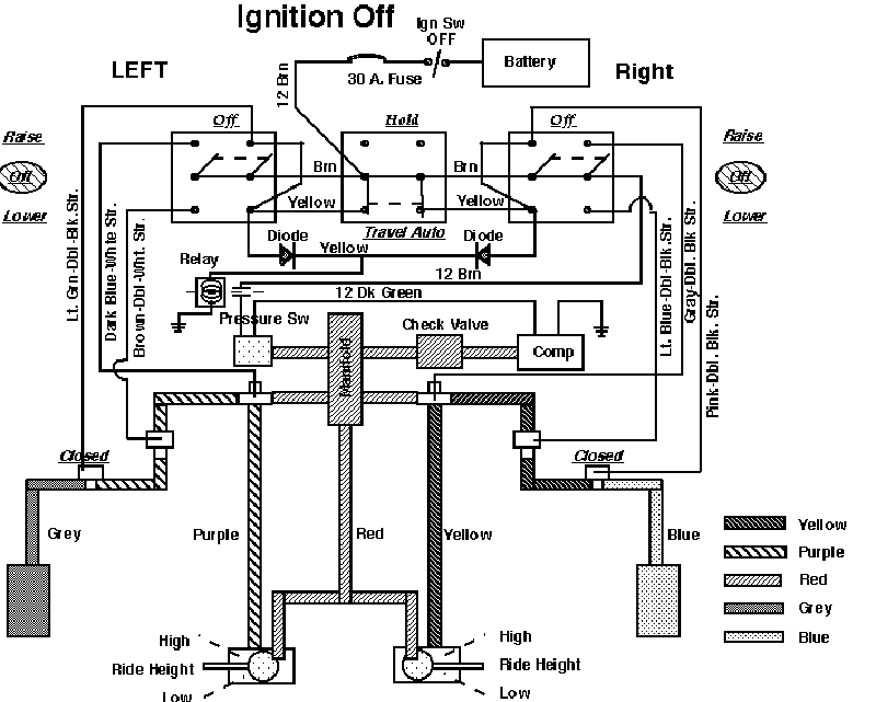 12). Take the yellow line off the 3 way valve. Center switch in Auto, right switch in the center position. Turn on the key and get some air pressure building. Is air escaping from the yellow line? Make sure the coach is above ride height, there should be no air flow. If there's air coming out of the yellow line, then the height valve is bad. Replace it.