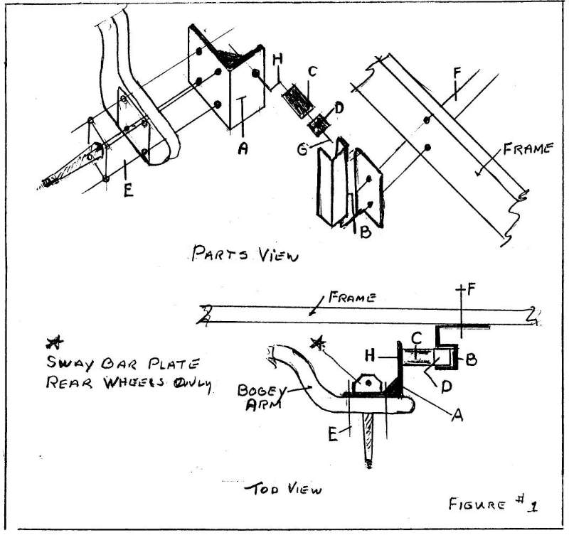 the back side of the angle bracket (to rear). Now position the rail bracket over the roller with the adjuster lock bolt loose. Place rail bracket against the frame with the top and bottom of the bracket even with the frame. The 1 3/4" long end of the rail portion will extend up. The cam follower and portion of cam will extend into the rail leaving 1/4" clearance to the back of the rail. Locate the mounting bolts position by marking the frame through the rail bracket holes. Drill 7/16 " holes and secure rails to frame, with l 1/2" bolts. (bolts and nuts furnished.) Caution check inside of frame for gas lines, wires or brake lines before drilling. Re-check all mounting bolts. Now check for proper clearance of cam follower mounting bolt heads (clearance 1/4"). Now adjust the cam to a neutral position, tighten bolt.(use "Lock Tight" on bolt). (Neutral position -0- clearance on both sides of roller in the rail no pressure.) Relocate emergency brake cable brackets (lower 1 1/2") so the alignment lock brackets do not rub the brake cable. To do this a new holes will be drilled to lower cable. Reinstall drums, wheels and tires. Inflate air bags as you lower the coach.