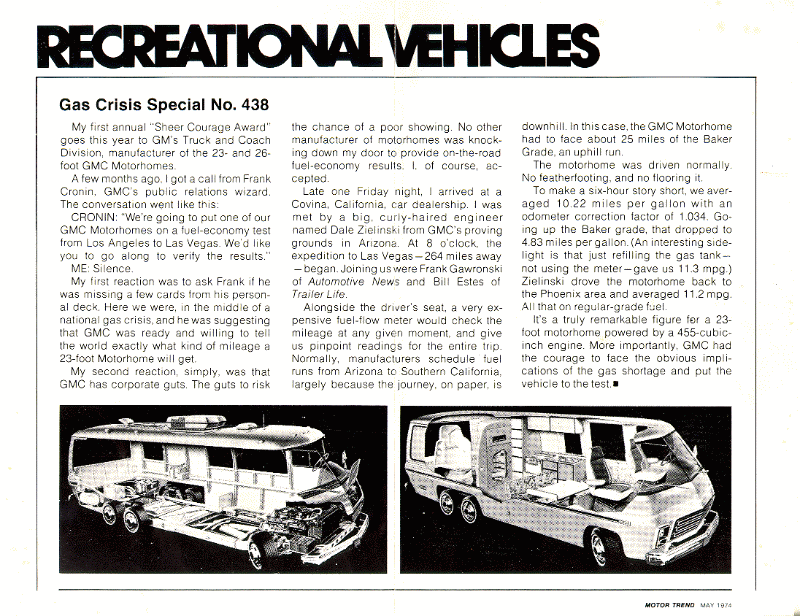 Bill Bryant (February 2004 FMCA) Collectibles With a Kitchen Sink by Chris Dixon for the July 2005 New York Times Still Cruising After All These Years Text by Jim and Audree Rowe (October 2008 FMCA) Trailer Made by Chicago Home Magazine - Rick Boltinghouse' GMC GMC Motorhome Registry In Action by Dave Greenberg (November 2009 FMCA) A GMC motorhome renovation by Todd Moning of FMCA "Member Stories" 1/26/2010. Motorhome Magnificence by Mike Bumbeck made possible by owner, Bill Jones. Hemmings Classic Car 5/2011. Brotherhood of the Wrench May 2012 Issue of Popular Mechanics GMCs at the Car Show by Jim and Audree Rowe, November 2012 FMC Magazine GMCMI Turns 30 by Janet Frey, April 2013 FMC Magazine I'd Like to Buy the World a Coke by Jim Koscs for 1/5/2015 "CocaCola Journey" GMC Remains on the Move by Jim Koscs for 1/27/2015 BBC Autos column. Why 1970s GMC Motorhomes Have a Cult-Like Following - 6/23/2015 Driving.ca Vintage RVs Make A Comeback 8/20/2015 Wall Street Journal 40 Years and Counting by Wayne Kinzie 3/2016 FMC Magazine The GMC Motorhome by Tim Dye for the Pontiac Oakland Museum GMCMI Interview 1-2017 by Pink Flamingo RV What Was the GMC Motorhome? 1-2018 by Tom Appel The Sturgeon Resurfaces in Nevada 6/2018 Why GM Cancelled the GMC Motorhome 11/2018 GMC Motorhome Front-Wheel-Drive Wonder by Kyle Smith for Hagerty 2/15/19 Happy Campers -The Woodward Talk 6/5/2019 GMC Motorhome Bad Timing by Ronnie Schreiber for Hagerty 2/21/20 Sprit of 76 (About Dick Missetts Grand Daughter) by Ed Kobeski for Incisal Edge Magazine 3/6/2020 The "Chuck Wagon" by Brett T. Evans for Motor1News 3/11/2020 Two Carpenters and a GMC by Marissa Hermanson for Dwell March 11, 2020 GM Design Tool, The Chuck Wagon by Daniel Strohl for Hemmings Motor News Sept 6, 2021
