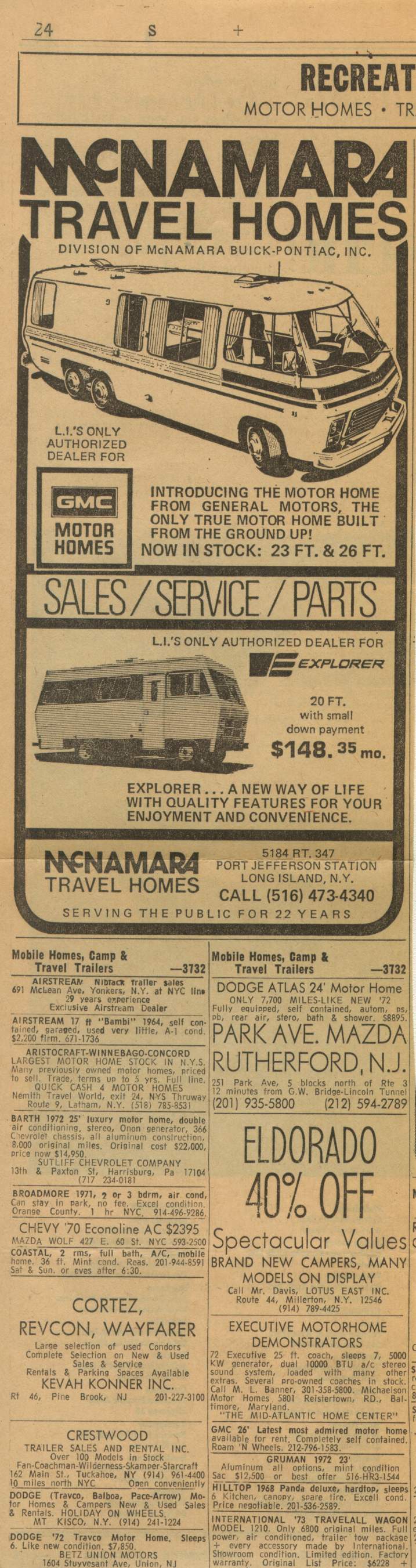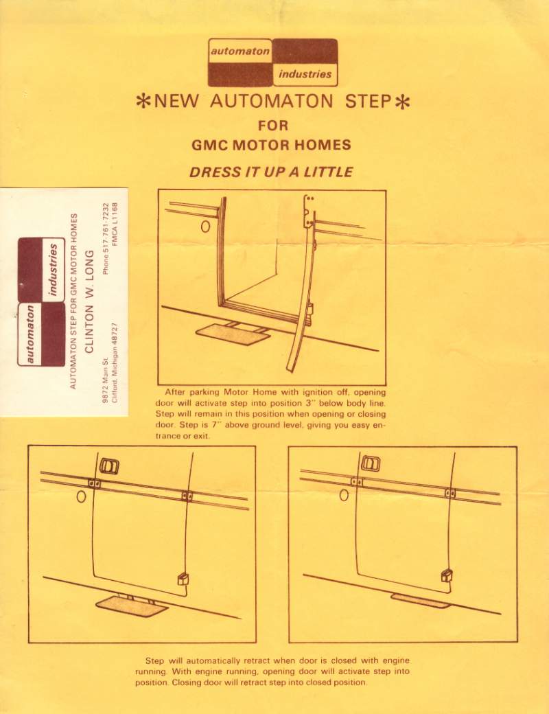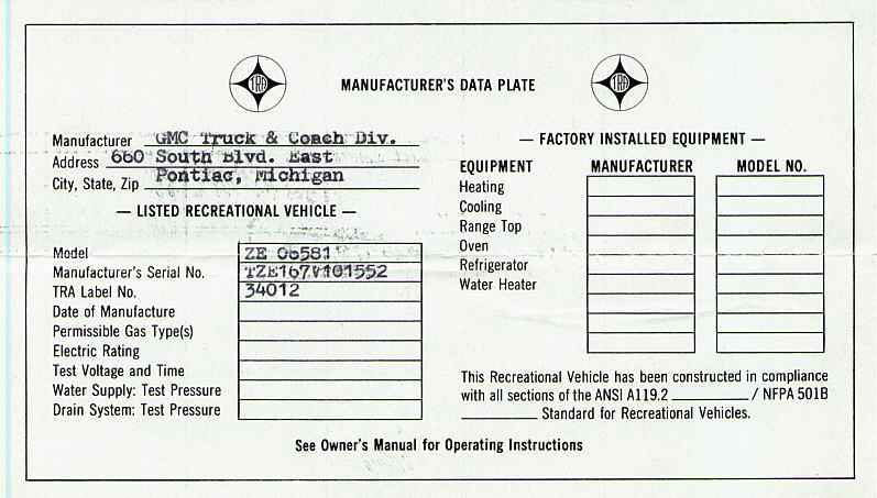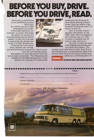 Click here for help in finding a GMC Motorhome for your very own Information Resources for GMC Motorhome Owners One of the primary sources: The GMCnet mailing list. Eugene Fisher's Excellent GMC Site Patrick Flower's GMCMotorhome.Com/tech (nastalgia) Click on any of the listed brochures to view them Here is a list of Publications and Advertisers that featured the GMC Motorhome. TRANSPO 72 Provided by Peter Brandt. Thanks Peter 1974 GMC Motorhome Offerings Provided by Norman Wheatley 1977 Driver's Dealer Directory (.8mb pdf) Thanks to Emery Stora 1977 Pricing Thanks to Bill Bryant 1977 Royale Thanks to Dan MacKinnon 1977 Birchaven Thanks to Bill Bryant 1977 and 1978 Accessories Catalog Thanks to Bill Bryant 1977 Place Mat and Jacket Patch Thanks to Dave Greenberg Yearly Gross Weight Chart Bill Bryant 1980 Driver's Dealer Directory Bill Bryant Avion 26' Interiors Thanks to Bill Bryant Avion 23' Interiors Thanks to Bill Bryant Roll-A-Long Thanks to Bill Bryant Coca Cola Thanks to Bill Bryant Edgemont Thanks to Bill Bryant Eleganza II GM Presentation of New Features Eleganza II Provided by Peter Brandt. Refined by Peer Schmidt Hughes Motor Coach of Ontario, Canada Thanks to Bill Bryant Wheat Motors Magazine Ad April 1985 Assorted Magazine Ads Thanks to Tim Brown and Roger Black The Wallace Front Wheel Bearing Flyer Clasco - The Dream's Alive! Thanks to Jerry Work Clasco Pride Brochure Thanks to Chuck Blanford Silver Motor Coach Thanks to Eric Tipton Solaire Furnace Owner's Manual Dometic Refrigerator Installation and Owner's Manual Thanks to Richard Elsley and Ray Davis Grueninger GMC Motorhomes (1.5mb pdf) Thanks to Emery Stora Water System Care Booklet (3.1mb pdf) Thanks to Emery Stora GMC Pre-Travel Checklist (.1mb pdf) Gary Rockwell VacationLand Coloring Book (.7mb pdf) Thanks to Dave Greenberg (Red Holman Covers courtesy of Bill Bryant) VacationLand Coloring Book (24mb pdf) Greatly enhanced for us by Karen Breen-Bondie Sliding Battery Tray Offer Dave Greenberg Classified Newspaper Ad Dave Greenberg Kentucky Horse Park Guide Cover Dave Greenberg GMC Automatic Door Step Dave Greenberg Zip Dee Catalog Page Dave Greenberg Zip Dee Brochure Bill Bryant March 1973 National Geographic AD Dave Greenberg 1978 Jimmy Motor Homes Dave Greenberg Announcing The GMC MotorHome Dave Greenberg Arcoa GMC Trailer Hitches Dave Greenberg Gemco Center Line Hitch Bob Burkitt Available GMC Optional Equipment Dave Greenberg Auxiliary GMC Heater Dave Greenberg Electro Level I Rear Suspension System Dave Greenberg Power Level Rear Suspension System Dave Greenberg Helpful GMC Tips from GMC Dave Greenberg Introducing the Eleganza II Dave Greenberg GMC Delights Booklet Dave Greenberg Grueninger Olds/GMC GO Express Dave Greenberg Liesure & Recreational Products, Inc. Dave Greenberg GMC Medical Unit Dave Greenberg GMC Motorhome Owner's Association Dave Greenberg GMC Motorhome Traveler Newsletters Glyn Trimble GMC MotorHome Recall Notices Dave Greenberg GMC Transmission and Final Drive Offer Dave Greenberg GMC Transmode Pamphlet Dave Greenberg Try Before You Buy Magazine Ad Thanks to Bill Brown Other Motorhomes that used the Toronado Front Wheel Drive Train Thanks to Bill Bryant GMC Data Plate Thanks to Chuck Blanford GMC Production and Shipping Order Chuck Blanford GMC Warranty Card Chuck Blanford KYB Shocks Brochure Thanks to Charles Wersal Onan / GMC Announcement Letter Thanks to Richard Hodges Onan Spring Tune-up Letter Richard Hodges Onan Original Parts Letter Richard Hodges Gemini Build Sheet Gary Worobec Stripes Movie Program Book (Japanese) Thanks to James Arledge Terry Olds GMC Brochure / Parts List Thanks to Jerry Work McNeal Dash Brochure Jerry Work GMC_Motorhome_Maintenance_and_Information_Notes by John Engebretsen Thanks to Ken Henderson Corporate Response Letter to GMC Inquiry and Dealer List Thanks to Chris Geils Gemini Vehicle Traveler sheet found taped to the water tank in 2014 Thanks to Kelly Money GMC II by Explorer Vans Parts Offerings Detroit Public Library Automotive History Collection Thanks to Karen Breen