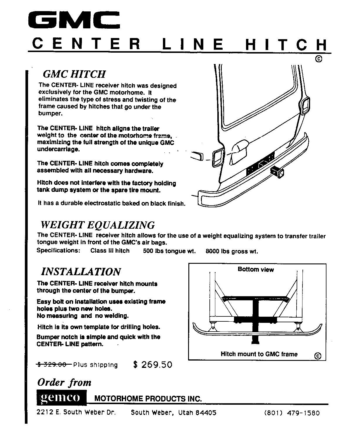 Another GMCer graciously sent this flyer to me. It is the one from which he ordered and received his Centerline Hitch in July of 1993. Total cost was $288.70 which included shipping from Utah to Illinois. I believe it is the one from which current production hitches are based upon. He says "As far as I can tell, Blaine Merrell's version is true to the original Gemco Centerline hitch that I have in every respect including the precise tubing for the receiver, unlike some other versions."