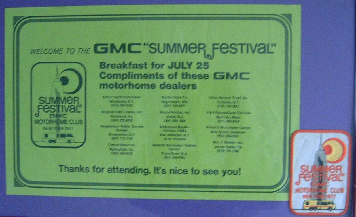 This paper place mat was used at a breakfast provided by GM Truck & Coach at the July 1977 rally in NY. All of the participating dealers are listed. Also, is a jacket patch that was given to attendees Photo is of a display in Dave Greenberg's collection |
