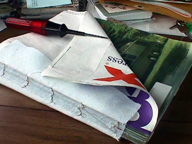 I often bind the books while I am on the road. There is more time to do the stitching and I get to review the material while I am doing the work. I use my light tester for the sharp punch; sort of a fitting touch for Motorhome magazines I think. Even if you do not have the cover for a while, the magazines are protected.