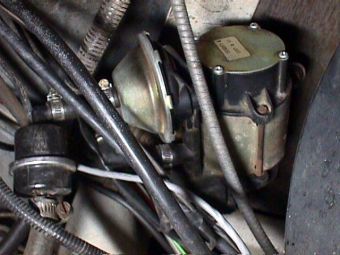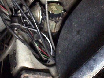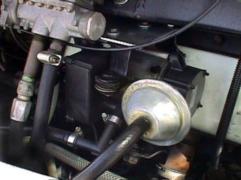 This mounting requires a homemade bracket to mount the pump in the position shown. This picture does not show the carbon filter going to the motor but this is necessary to keep residues from the engine and vice versa. Notice the Right angle hose that exits the pump. The adaptor comes with the pump and attaches hose to the brake vacuum booster. This connection is hard to see in the other mounting pictures. |
